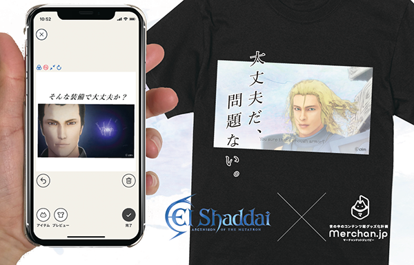 今回の企画では、エルシャダイのあの名シーン、名台詞のアイテムを100以上ご用意。コロナ禍で対面販売が難しくなっていますが、手軽に公式グッズを作成できる『Merchan.jp』アプリの魅力を、この機会にぜひご体感ください。