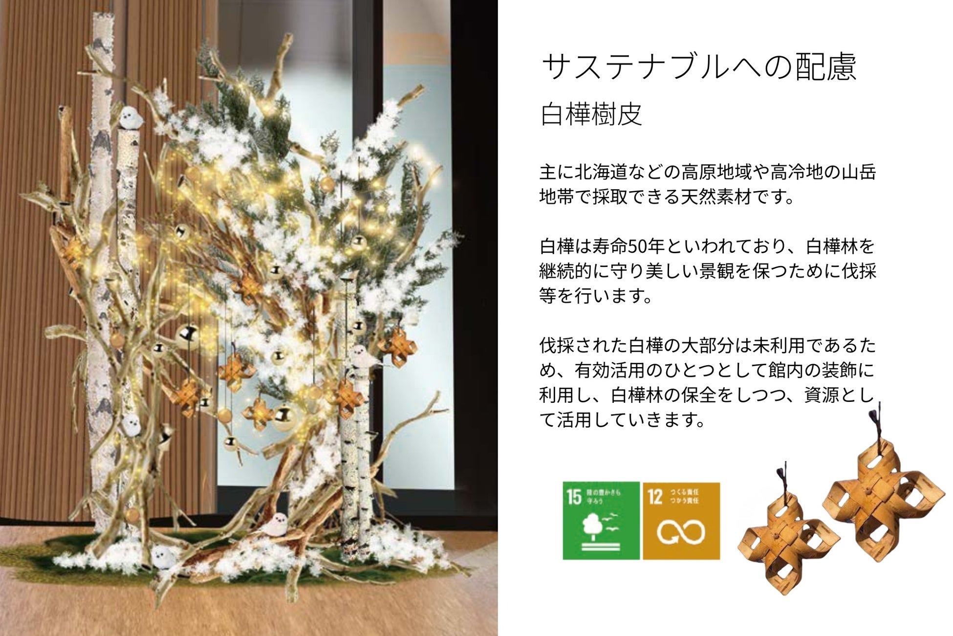 またフロントロビーの装飾に使用されるオーナメントは、白樺の樹皮を用いてホテルのスタッフがゲストへの感謝の気持ちを込めて手作り。また趣旨に賛同いただいたゲストがこの活動に参加できるようオーナメントの販売を行いその売上の全額を「公益社団法人 北海道森と緑の会」へ寄付します。ご希望の方には、お子さまでも簡単にその場で作成できる手作りキットとしての提供も予定しています。