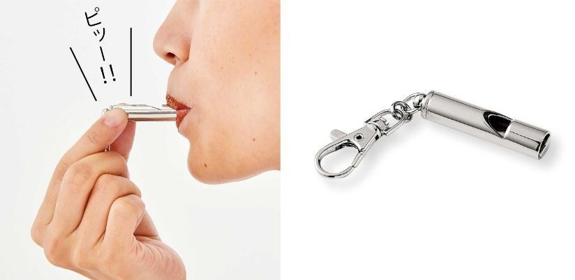 いざという時に吹けば「ピッー!」と大きな音で、居場所を知らせることができるホイッスルです。ナスカン付きで、キーホルダーのように携帯できます。男女問わず使いやすいよう、メッキはシルバーのカラーを選びました。
