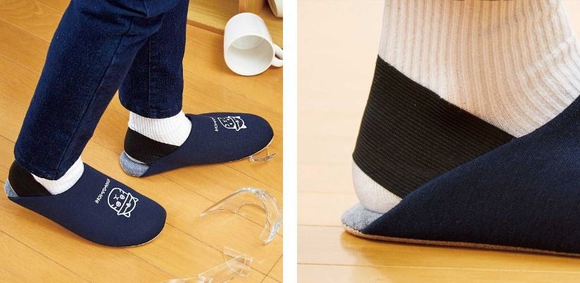 ふだんはスリッパとして使いながら、もしもの時にはかかとのゴムを引っ掛けて固定し、走ることもできるルームシューズ。