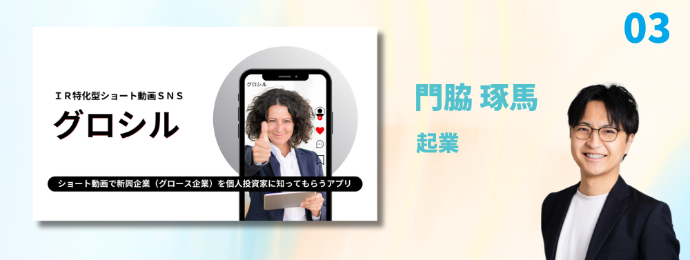 三菱UFJ銀行、ポラリス・キャピタル・グループ等でファイナンス、M&A業務に従事した後、デジタルマーケティングを行う2021年上場のエフ・コードにて執行役員としてM&A、IR等を担当。2023年G's ACADEMYに入学し、新興企業のIR手法を変えるSNSアプリの開発を目指し挑戦中。