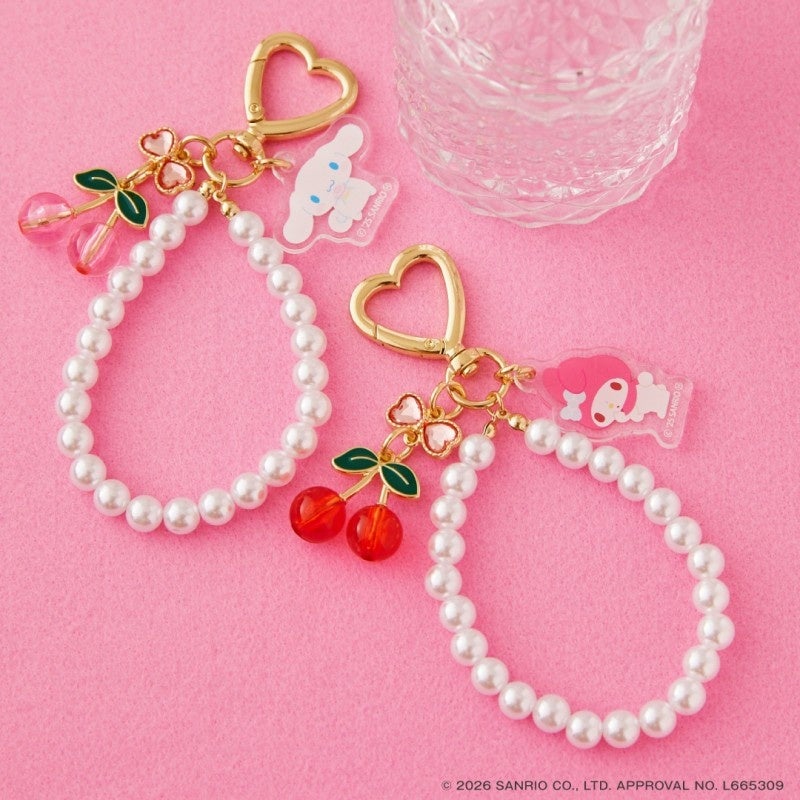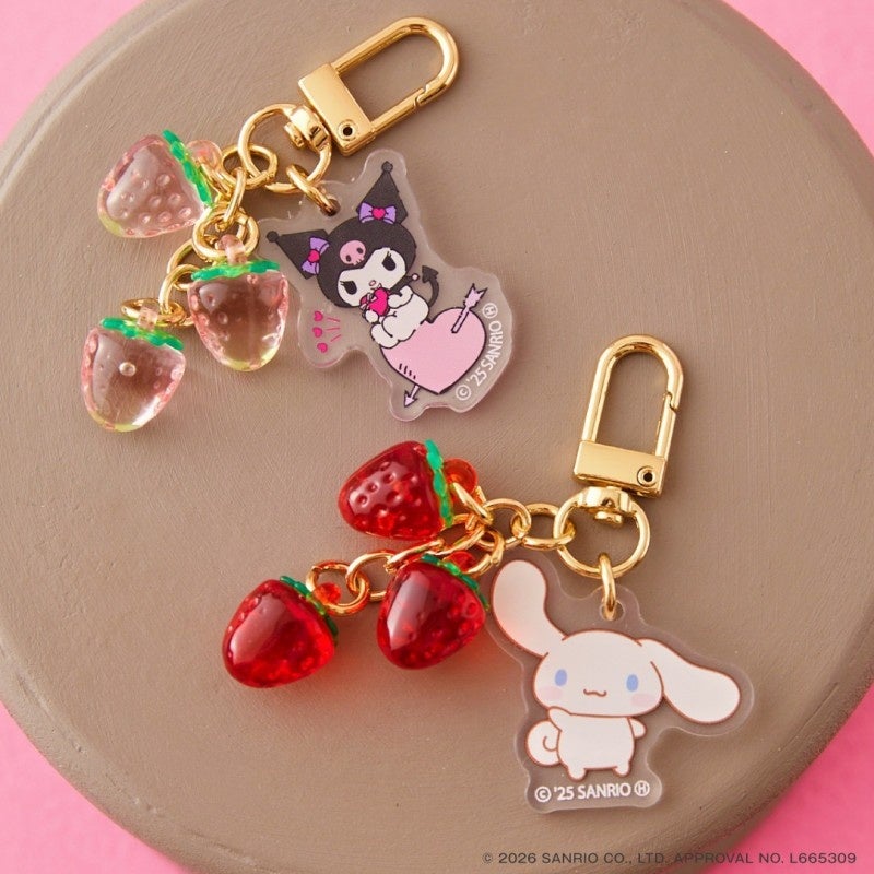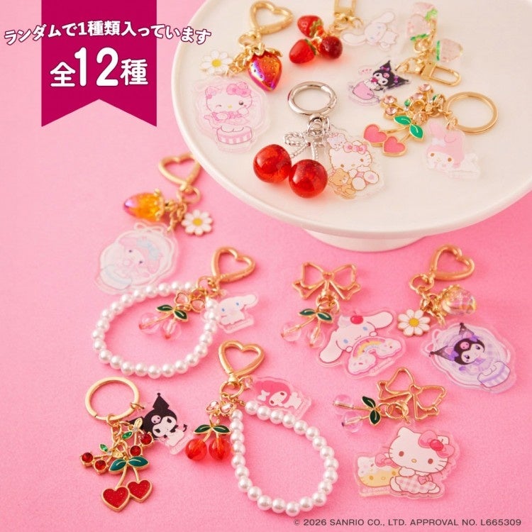 ハローキティ、シナモロール、マイメロディ、クロミと、きらきらフルーツを組み合わせた全12種のチャームがランダムで登場。バッグやスマホに付けて楽しめます。