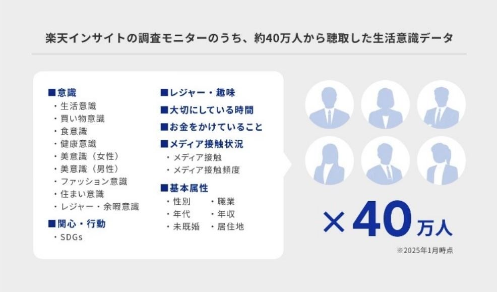 楽天インサイトが別途収集した豊富な登録情報を活用し、掛け合わせて分析することが可能です。具体的には生活意識データ(約240項目の意識・価値観)やカテゴリーデータなどの大規模調査結果「アスキングビッグデータ」と組み合わせることで、ターゲットの志向をより明確に把握することができます。