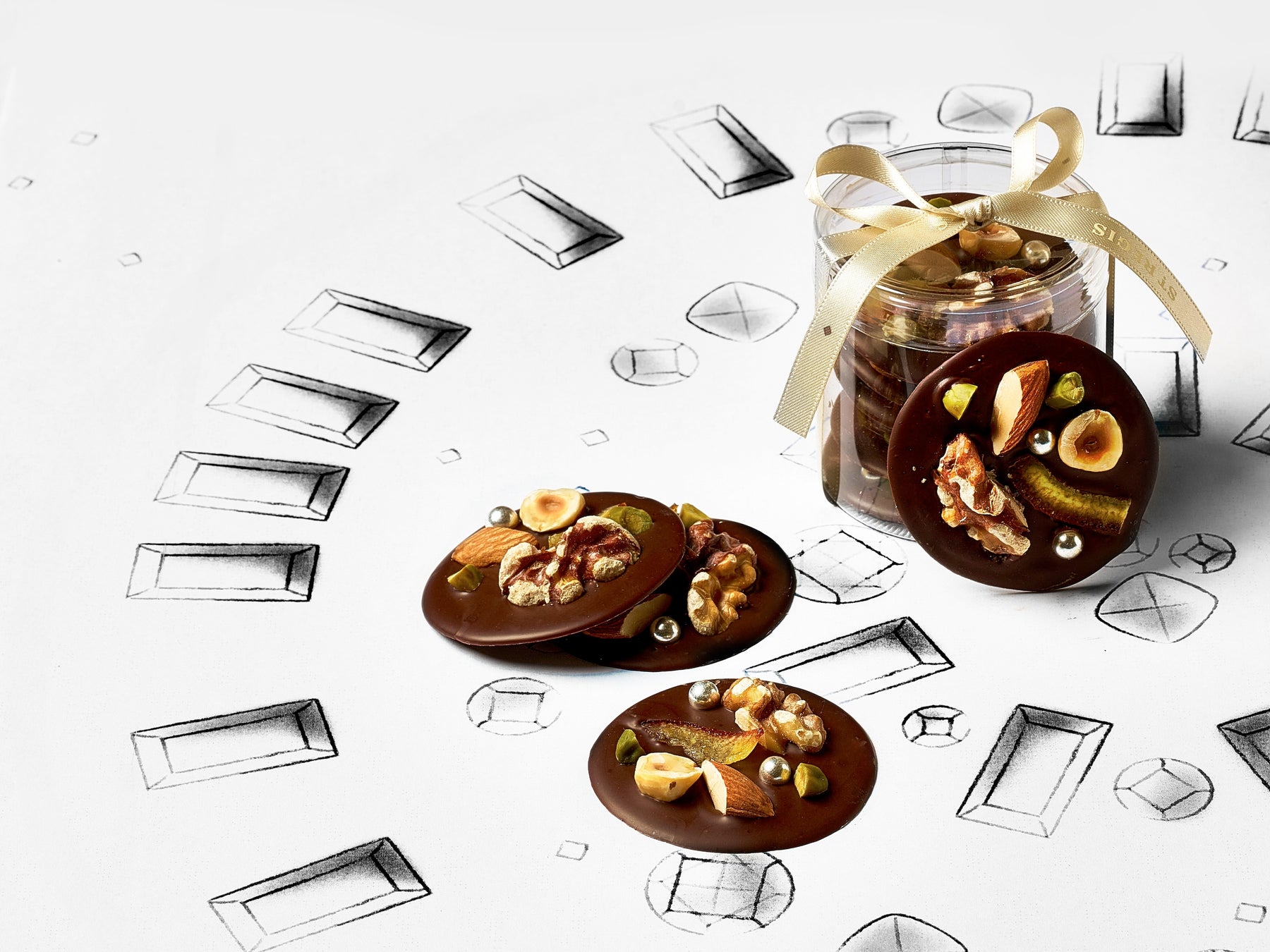フランス・ヴァローナ社の上質なチョコレートに、オレンジピール、ピスタチオ、クルミ、ヘーゼルナッツ、アーモンドをあしらい、シルバーのアラザンで華やぎを添えたマンディアン。ひと口ごとに異なる食感と風味が広がり、まるで宝石を散りばめたような華やかさを宿します。