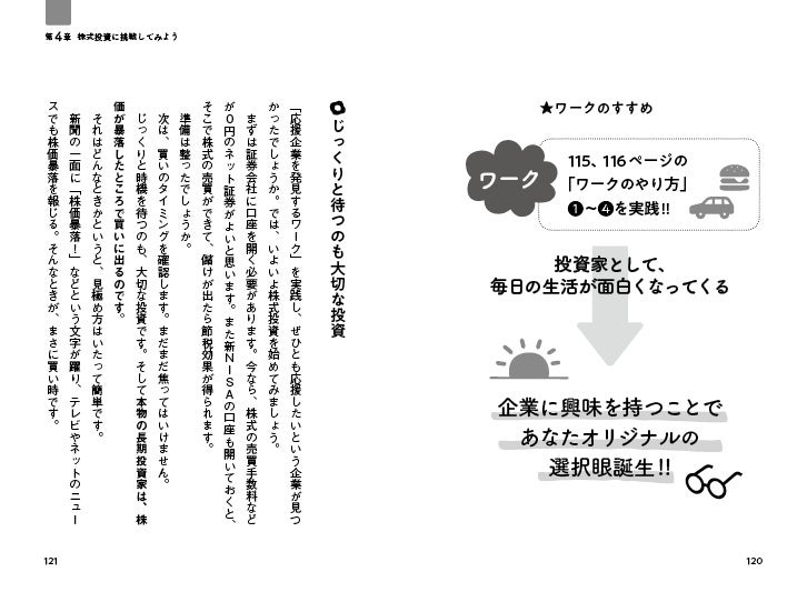 株を買う場合は、あくまでも長期保有できる、読者の方が心から応援できる企業を探すところから始まります。自分がその企業を長期にわたって応援し、無理なくウォッチできる企業をどう見つけるかについてはちょっとしたゲームのような著者独自の探し方も載っています。