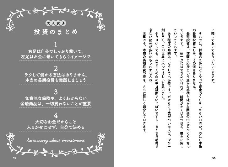 でもまず知っておいてほしいのは投資をすることにどんなメリットがあるかという点です。投資=怖い、損をするという意識を持つ方がまだまだ多いのですが、将来的な人生設計のために投資だからこそ資産を作れる理由がこの本ではていねいに説明されています。