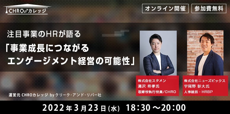 クリーク・アンド・リバー社は3月23日(水)、さらなるキャリアアップを考えている現役CXOや組織開発・事業開発・経営に関わる方、未来のリーダーをめざす方などを対象に、オンラインセミナー「注目事業のHRが語る“事業成長につながるエンゲージメント経営の可能性”」を開催いたします。なお、本セミナーには、株式会社ニューズピックスの人事統括/HRビジネスパートナー(HRBP)を務める宇尾野彰大氏と株式会社スタメンの取締役執行役員/CHRO・満沢将孝氏が登壇いたします。