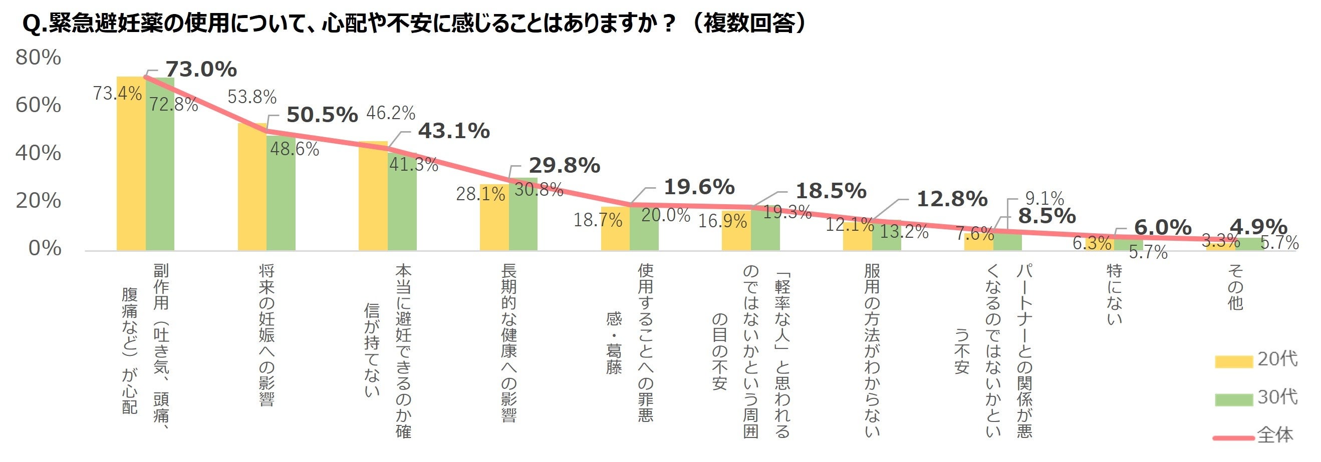 ●緊急避妊薬の使用に関する不安のトップは「副作用(吐き気、頭痛、腹痛など)が心配」で7割超