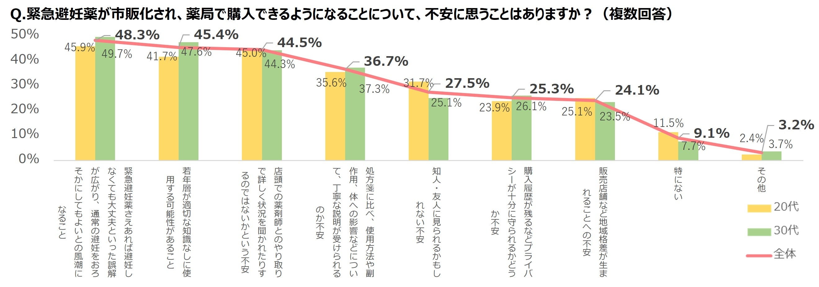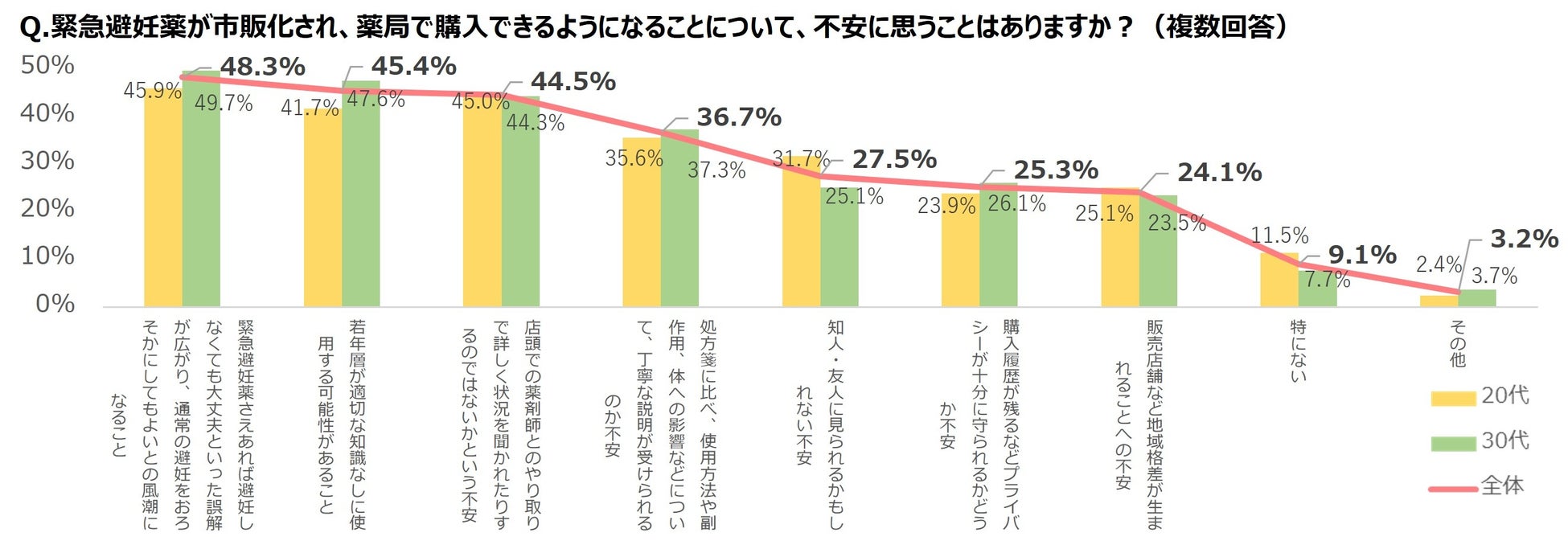 ●緊急避妊薬の薬局販売にあたって女性が感じる不安のトップは、「緊急避妊薬さえあれば避妊しなくても大丈夫といった誤解が広がり、通常の避妊をおろそかにしてもよいとの風潮になること」(48.3%)