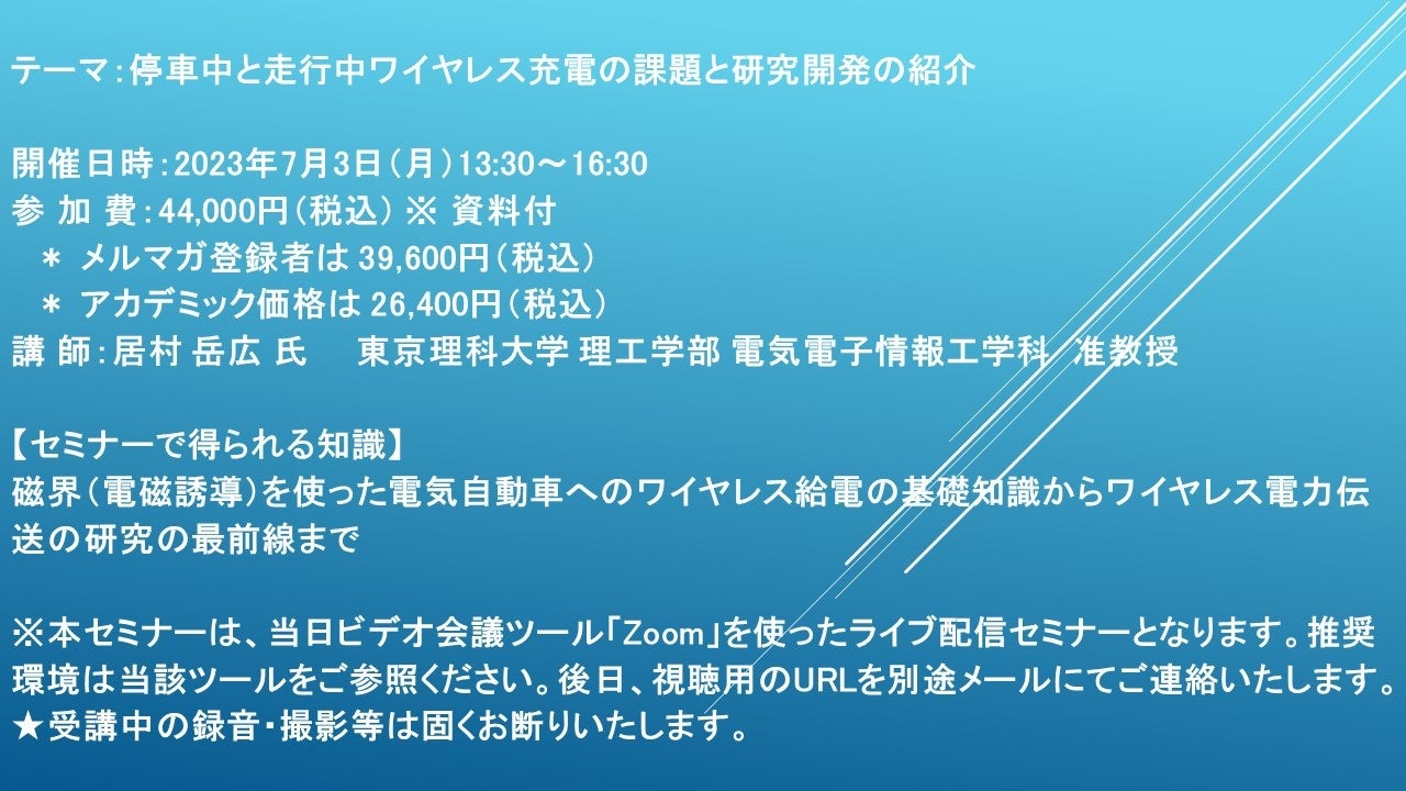 【ライブ配信セミナー】停車中と走行中ワイヤレス充電の課題と研究開発の紹介 7月3日(月)開催 主催:(株)シーエムシー・リサーチ