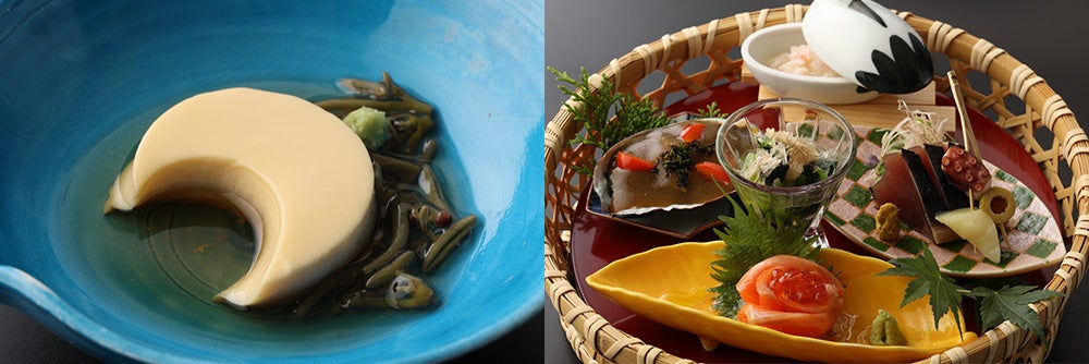 献立にはコラボ刀剣男士にちなんだメニューもご用意。ひんやりとした食感の「三日月豆腐と順才」(三日月宗近)や、鶴の器に盛られた「鶴盛蟹霙和え(鶴丸国永)」。濃厚な「鮑肝ソース香味焼きと赤パプリカ(加州清光)」に、銀髪からイメージした「銀鱈西京焼き(山姥切長義)」など、暑い夏のパワーアップにも最適なボリューム満点のラインアップです。