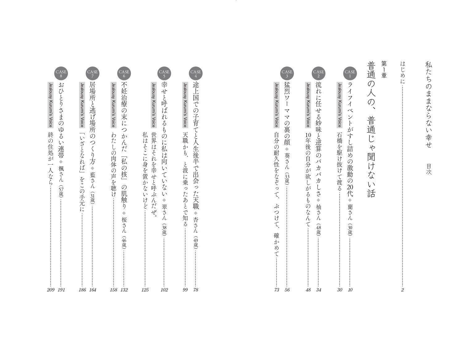 本書では、人気コラムニストのジェラシーくるみさんが、30代~50代の一般女性8人にロングインタビューし、今までの選択の過程、人生の分岐点、重い決断の裏側、しのいできた苦境や葛藤をしっかり聞いてまとめたもの。