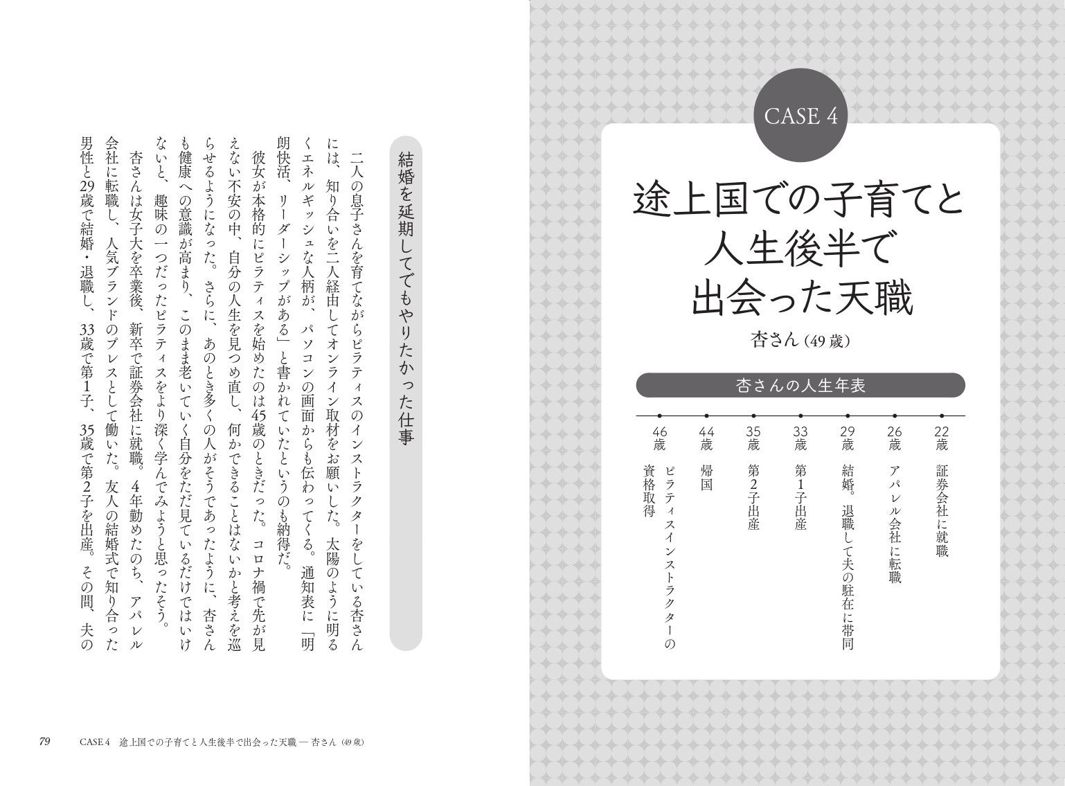 登場するのは20代で結婚、出産、別居、離婚、再婚、海外移住した人。20代でキャリアをあきらめて夫の海外赴任についていき、40代後半で自分の夢を実現している人。30代半ばで不妊治療をあきらめ、いまは子どものいない人たちの活動を手伝っている人。20代で日本各地を転々としながらシェアハウスに住み、ライターの仕事をしていた人。日本での痴漢や暴力にあい、自身の成長も考えてオランダに住んでいる人。
