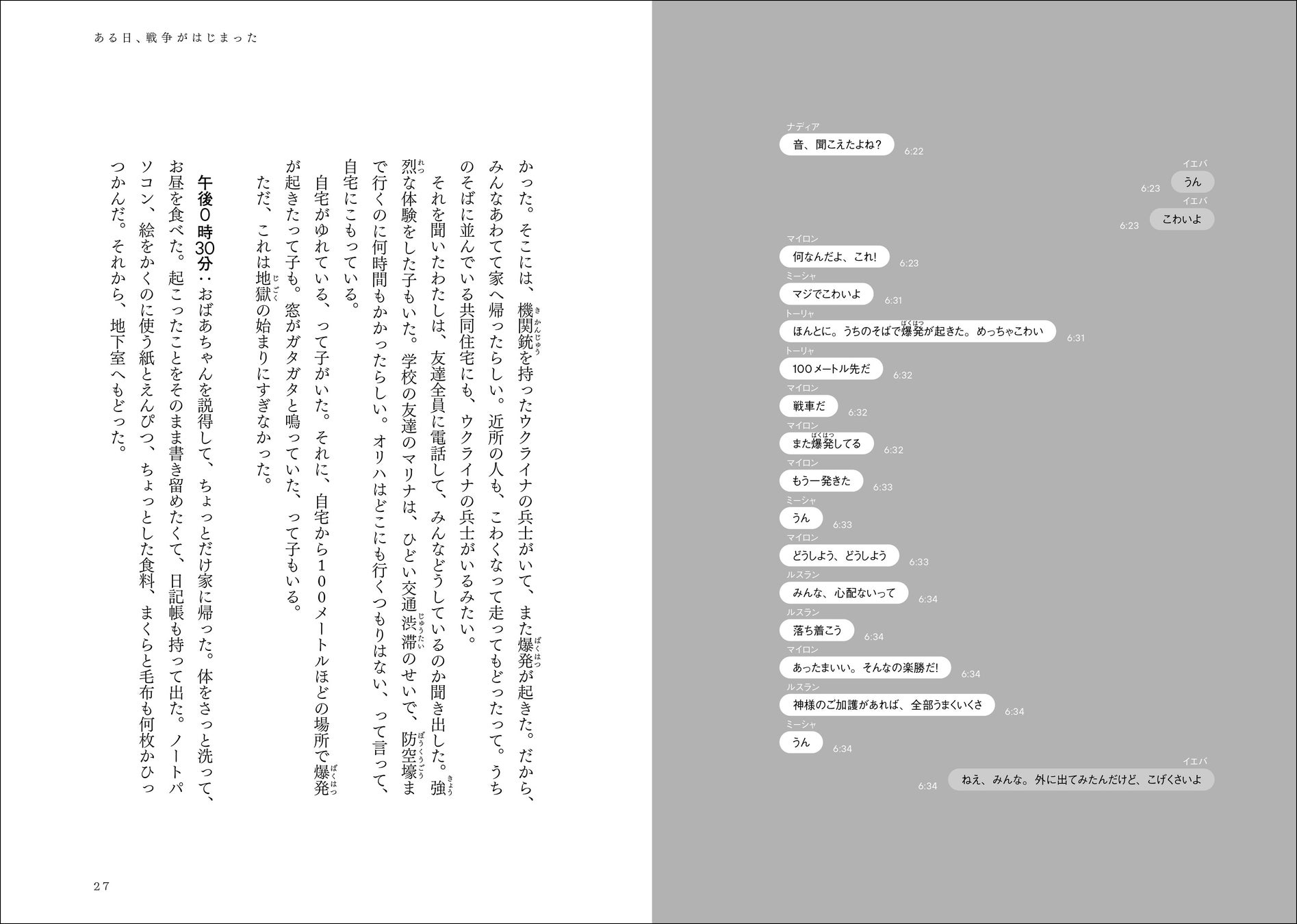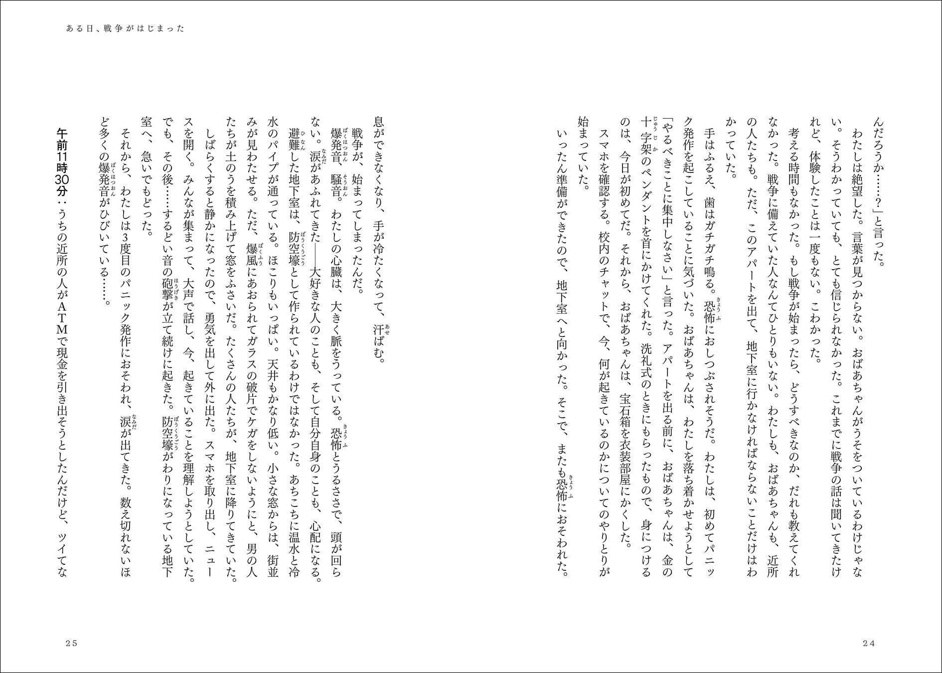 爆撃の恐怖に震えながらの避難生活、戦火を逃れるために故郷を離れて西へと向かう決断、離ればなれになってしまった学校の友人たちとのメッセージのやり取り、突然の戦争に疲弊し、苦しみながらも前向きに生きようとするイエバさんの思いなど、大人とは違う感性で表現された「誰も知らない戦争のリアル」は、国際情勢に興味がある大人から、著者と同じように学校へ通う10代の若者まで、幅広い層の読者の心に響き、平和の意味を考えるきっかけになるはずです。