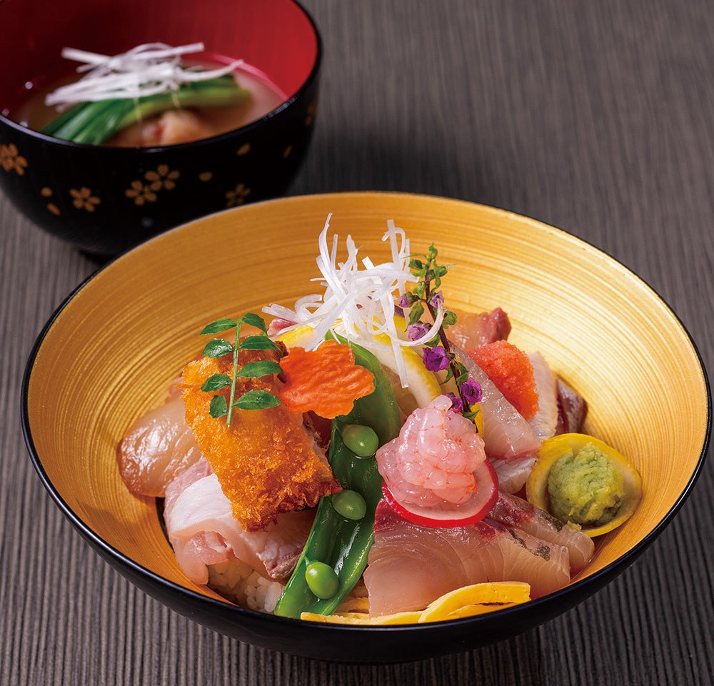 ねじめ黄金カンパチを5つの味で楽しめるスペシャル丼、博多の技が光るカンパチ尽くしな一杯です。