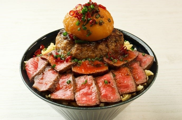鹿児島県産の黒毛和牛と黒豚の合い挽きで作られたふわとろ系のハンバーグにさらに贅沢な黒毛和牛ステーキを盛り付けました。