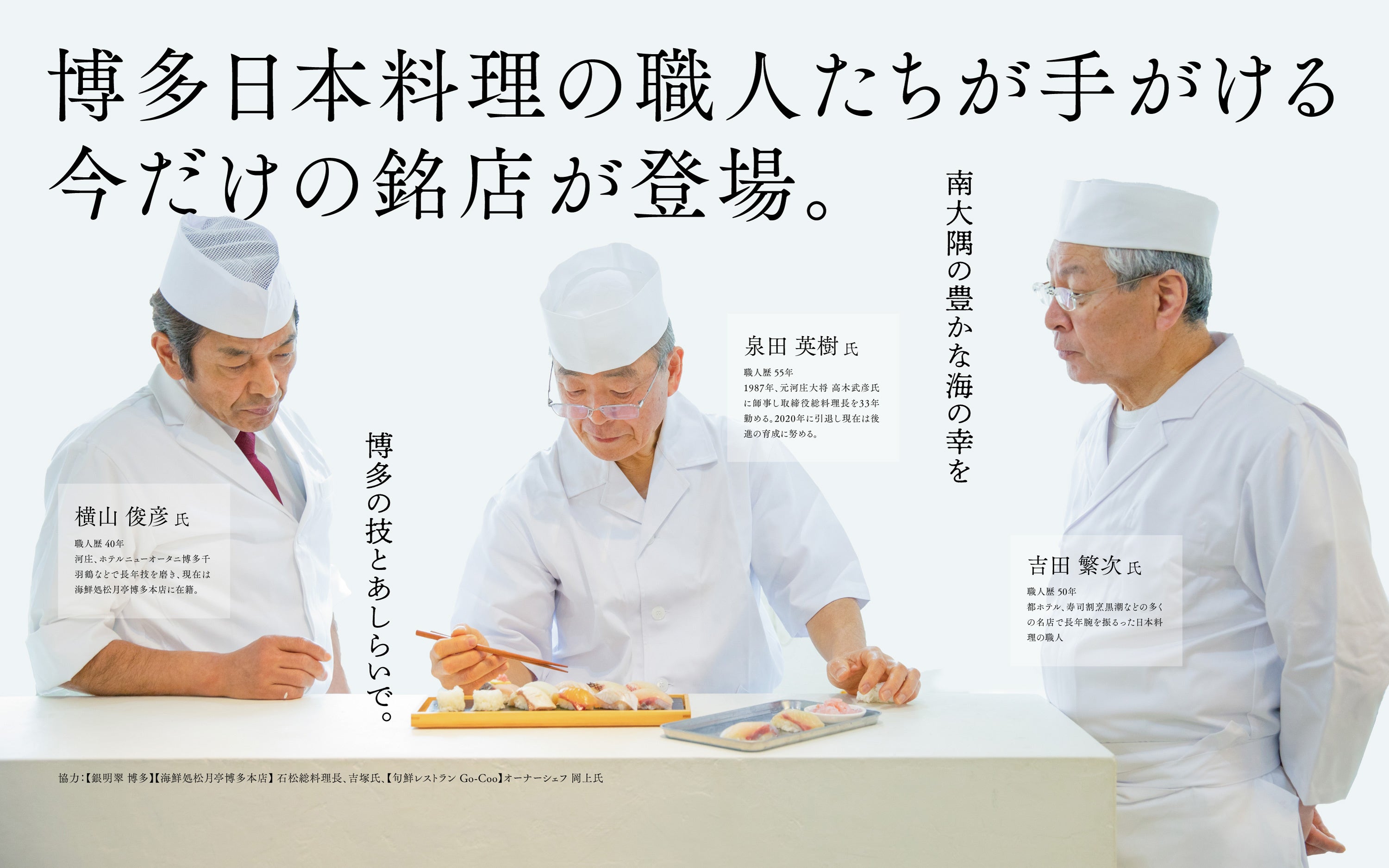 ねじめ黄金カンパチ、ヒラマサなどの鹿児島素材が、博多の職人による技とあしらいで見て・食して満足いただけるメニューとして登場します。