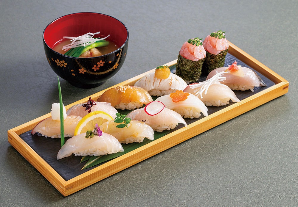 南大隅の海の幸を存分に使い至高のあしらいをほどこした芸術的な博多流の寿司、見て食して楽しめる贅沢なセットです。