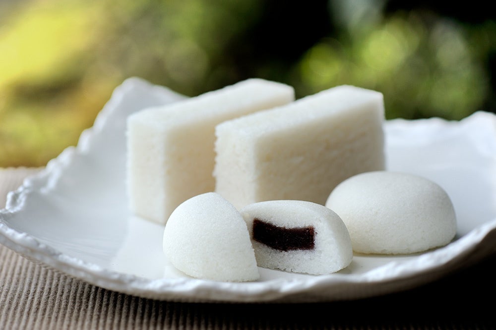 もっちりとした独特な食感の軽羹で、小豆こし餡を包みました。
