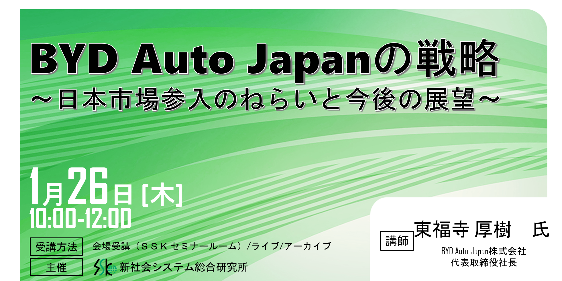 「BYD Auto Japanの戦略」と題してBYD Auto Japan株式会社 代表取締役社長 東福寺 厚樹 氏のセミナーを2023年1月26日(木)に開催!!