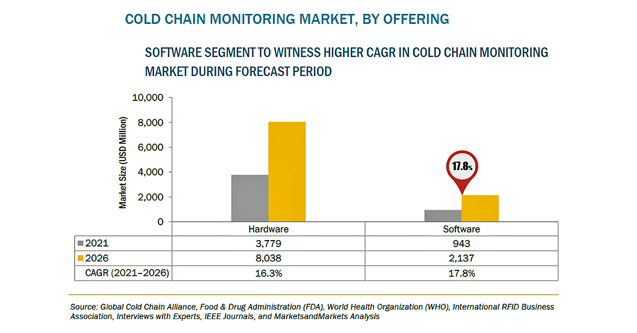 コールドチェーンモニタリングの市場規模は、2021年の47億米ドルからCAGR16.6%で成長し、2026年には102億米ドルに達すると予測されています。これは、医薬品・ヘルスケア用途での利用が拡大していることに起因していると思われます。
