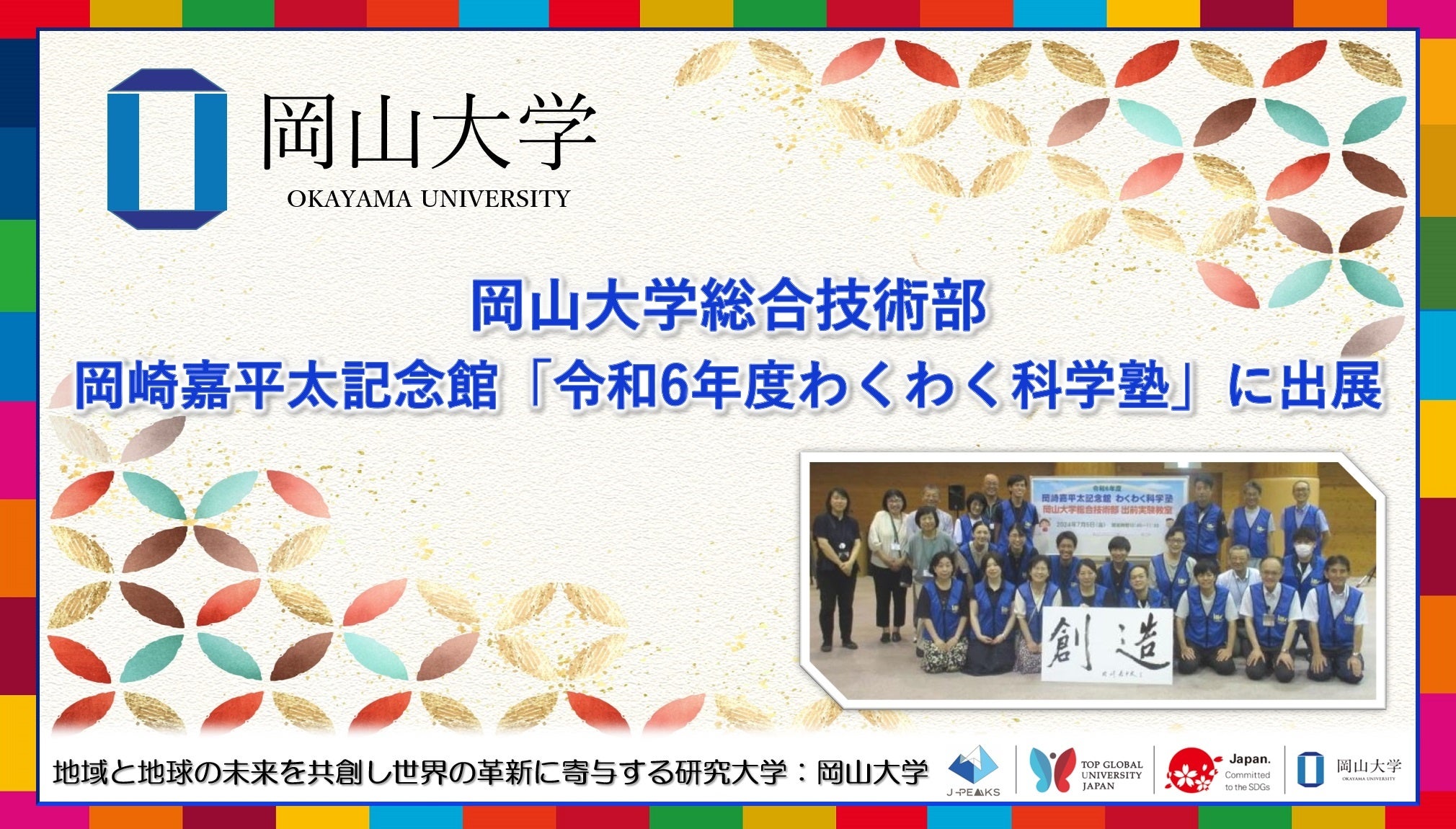 国立大学法人岡山大学(本部:岡山市北区、学長:那須保友)の技術統括監理本部を構成する組織のひとつである総合技術部は、2024年7月5日にきびプラザ(岡山県加賀郡吉備中央町)で開催された岡崎嘉平太記念館「令和6年度わくわく科学塾」に出展しました。