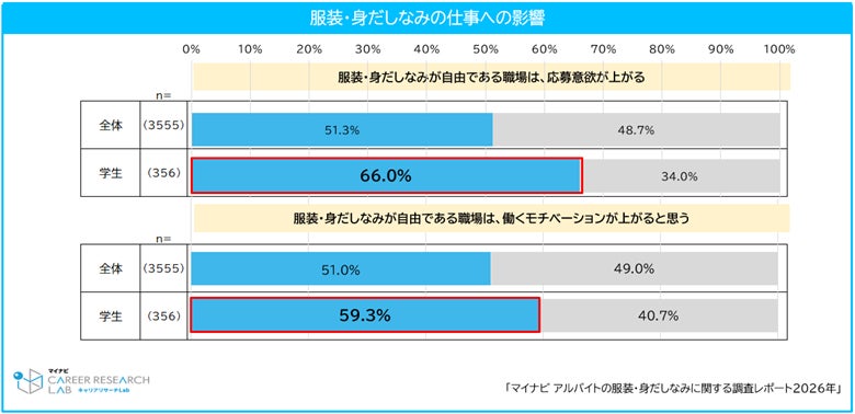 アルバイト就業者のうち、「服装・身だしなみが自由である職場は、応募意欲が上がる」割合は、全体で51.3%、学生に限定すると66.0%で全体より10pt以上高かった。