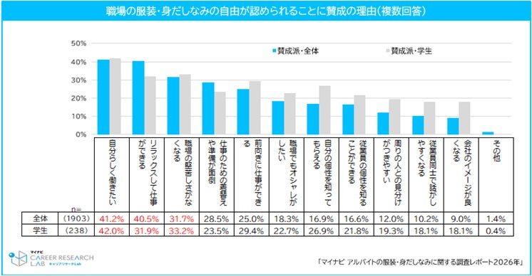 賛成理由では、全体・学生ともに「自分らしく働きたい」「リラックスして仕事ができる」「職場の堅苦しさがなくなる」が上位となった。