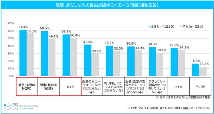 また、アルバイト就業者に、服装・身だしなみにおいて自由が認められるべきだと思う項目を聞いたところ、全体・学生ともに「髪色」「髪型」「メイク」が上位となった。【図1、2、3、4】