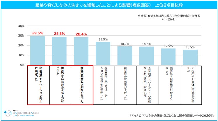 また、服装・身だしなみの決まりを緩和した影響について聞くと、良い影響では「従業員のモチベーション向上に繋がった」が29.5%で最も多く、「働きやすい会社のイメージがついた」「職場の堅苦しさがなくなった」と続いた。【図6、7、8】
