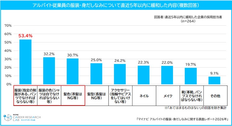 緩和した具体的な内容では、「服装」が53.4%で最も多く、「服装の色(32.2%)」「髪色(30.7%)」と続いた。