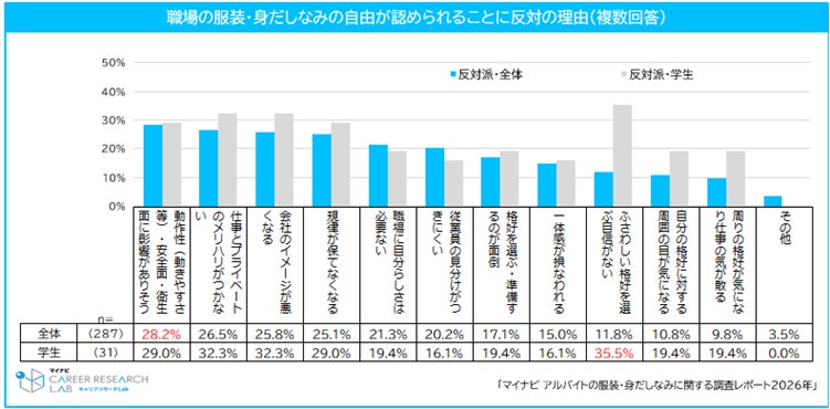 反対理由をみると、全体では「動作性(動きやすさ等)・安全面・衛生面に影響がありそう」が最多となった。一方、学生は「ふさわしい格好を選ぶ自信がない」が最も多かった。