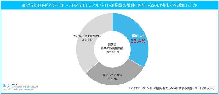 企業の採用担当者に「直近5年間(2021年~2025年)で従業員の服装・身だしなみの決まりを緩和したか」を聞いたところ、33.4%が緩和したと回答した。