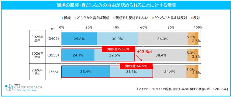 アルバイト就業者に「職場の服装や身だしなみの自由が認められること」の賛否を聞いたところ、賛成(賛成24.1%+どちらかと言えば賛成29.5%)は53.6%で、前年に続き過半数を占めた。学生(高校生+大学生)に限定すると、賛成が66.9%で全体より13.3pt高かった。