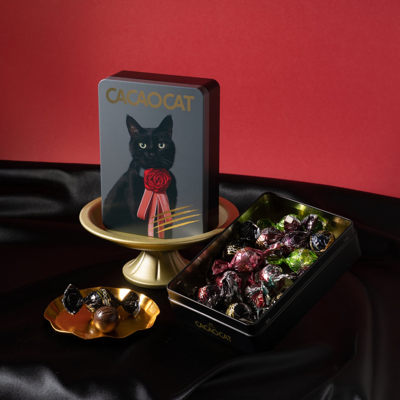 〈CACAOCAT〉➀CACAOCAT缶 14個入 NOIR 2,894円※数量限定 ②CACAOCAT缶 9個入 mmts 各色1,894円/地階イベントスペース(明治屋横)