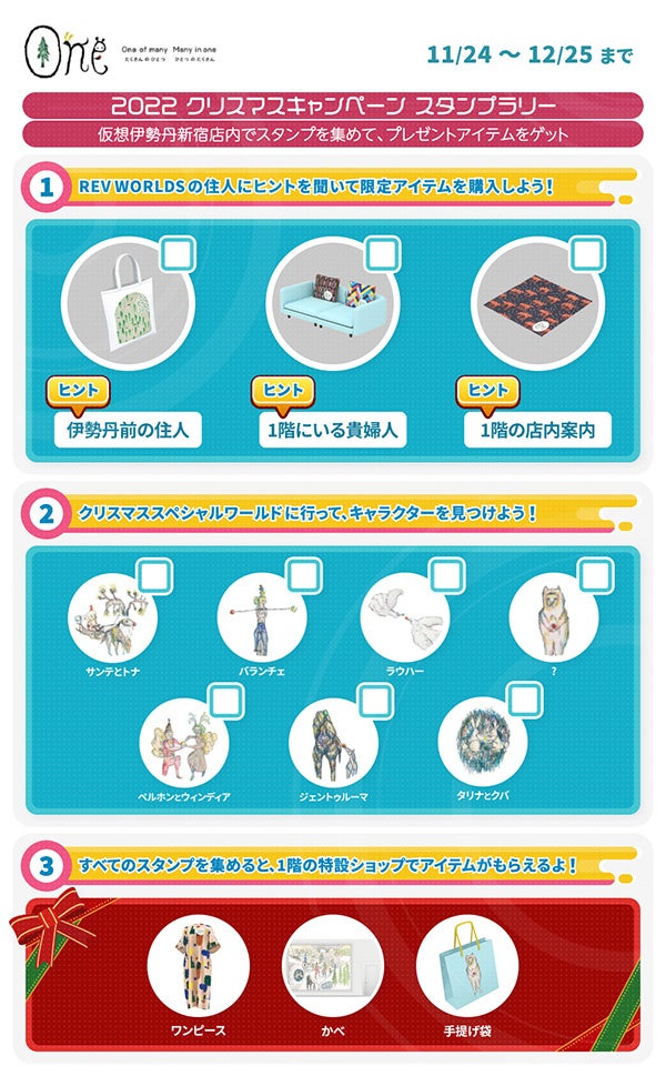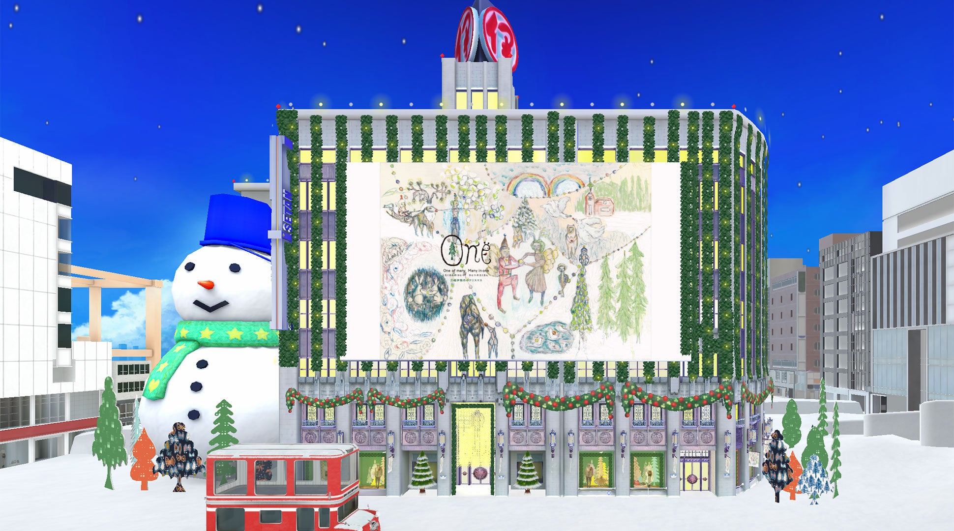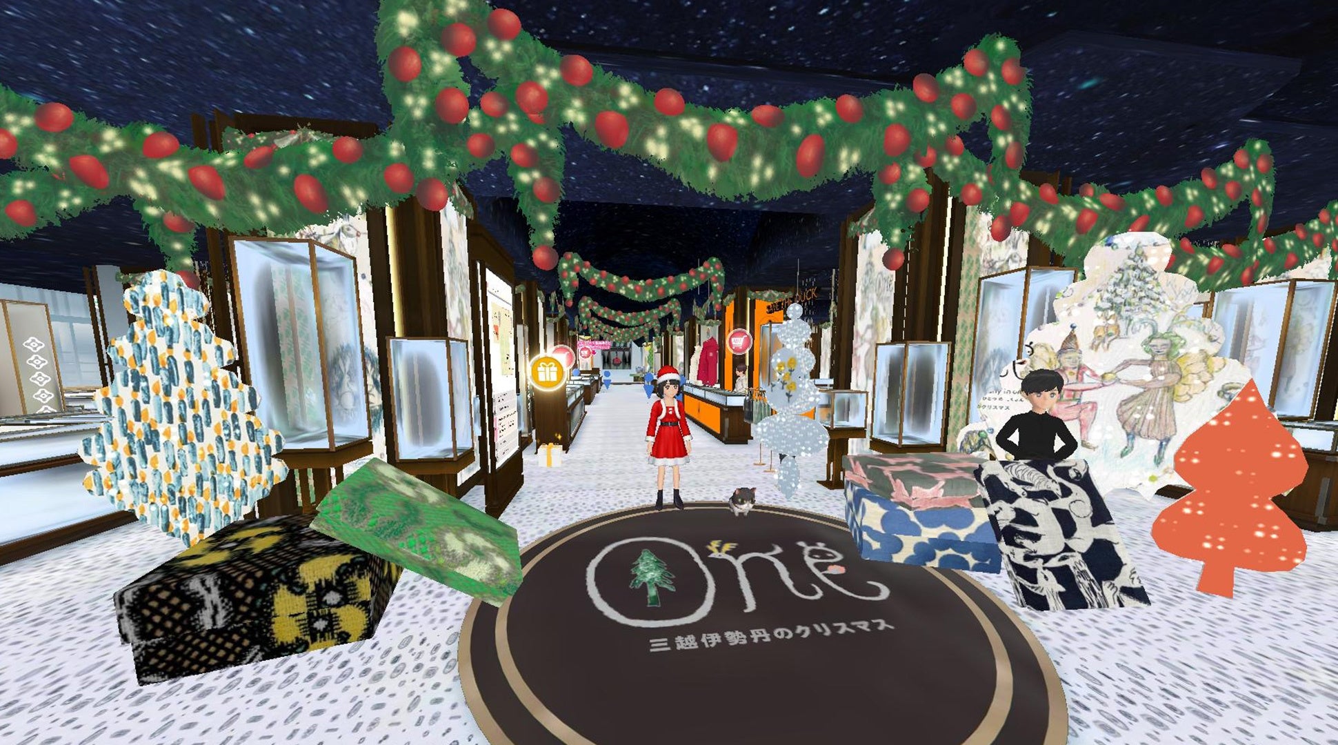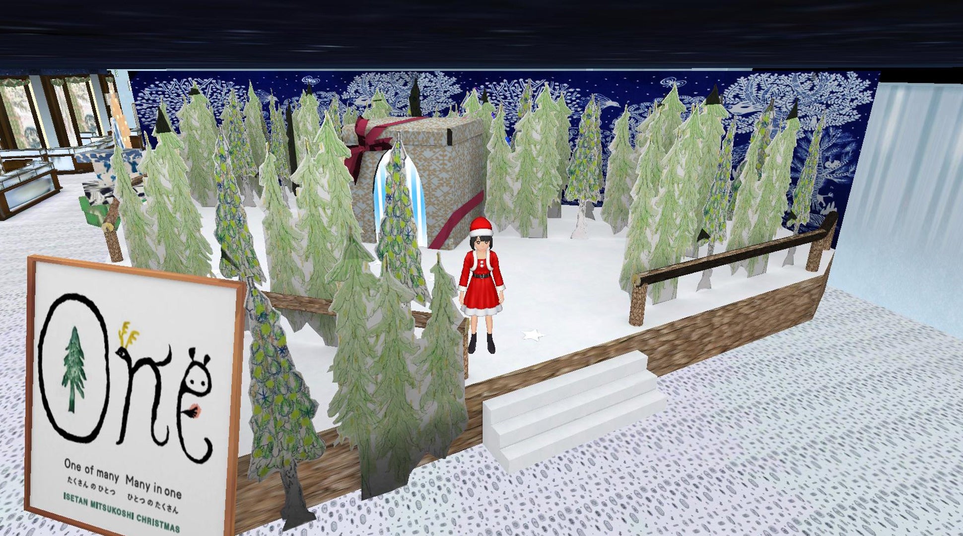 会期中、仮想伊勢丹新宿店の店内が、「One」のメインビジュアルやキャラクター、<ミナ ペルホネン>のアーカイブテキスタイルを使用したクリスマス期間限定の装飾で彩られます。お客さま(ユーザー)は、バーチャルならではの遊び心あるクリスマス装飾や仕掛けを楽しんでいただけます。
