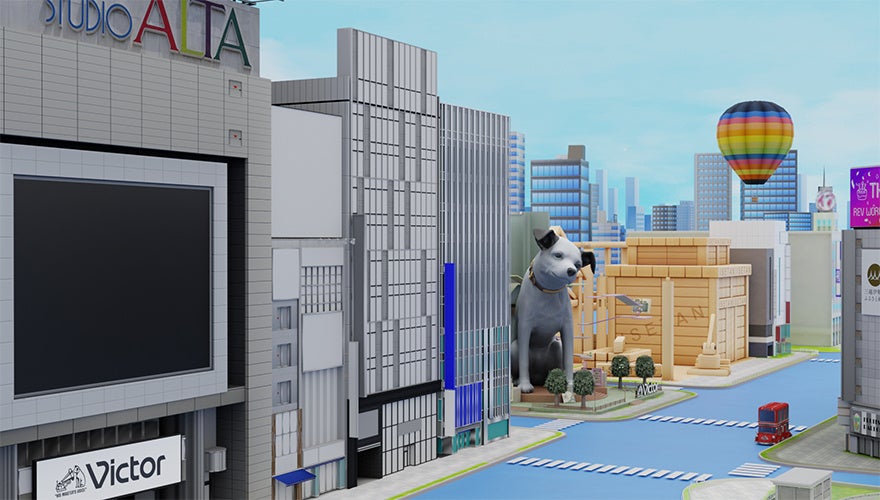 「ニッパーとあそぼう サウンドパーク」が仮想新宿にオープン。ブランドアイコンである犬の「ニッパー」の巨大な像を中心に、遊びながらVictorのブランドや世界観を体感できるエリアです。