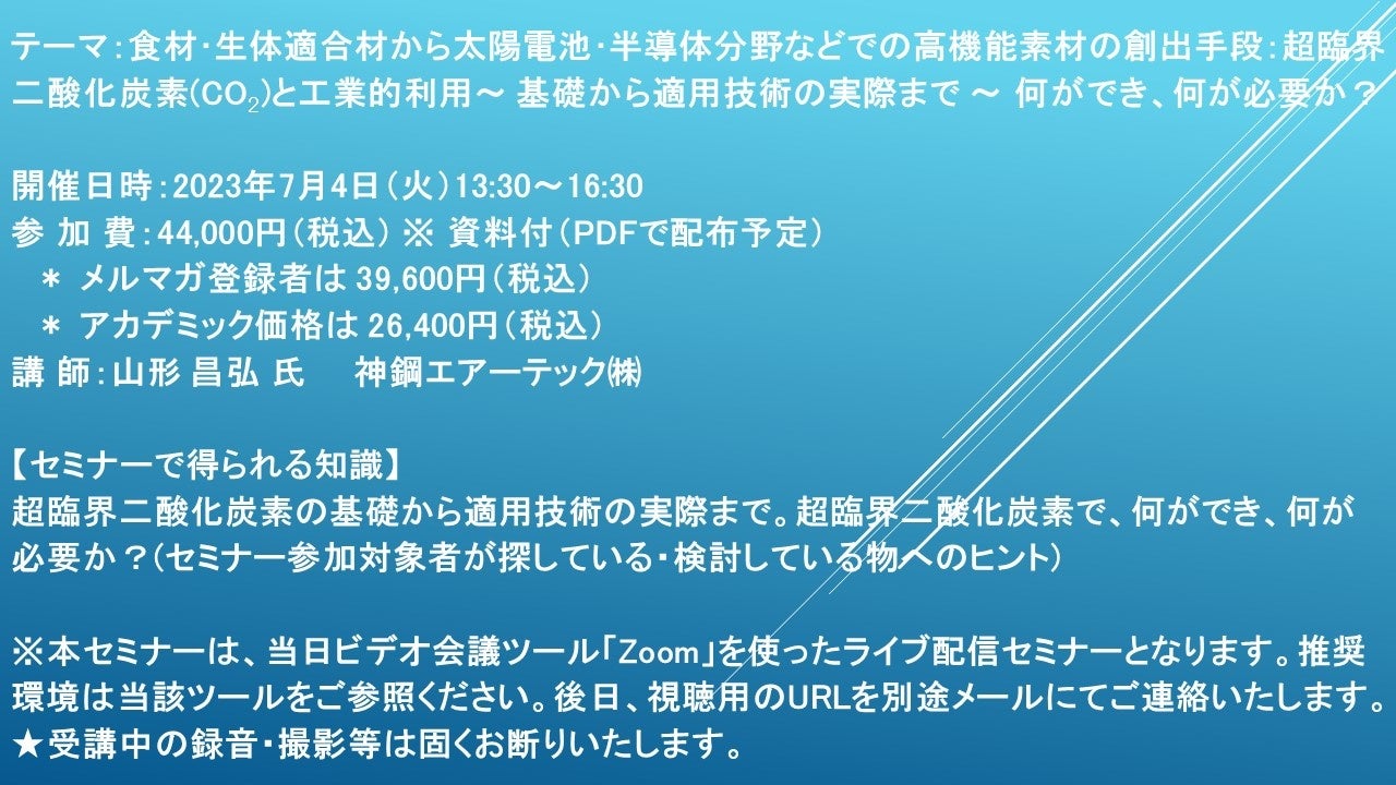【ライブ配信セミナー】食材・生体適合材から太陽電池・半導体分野などでの高機能素材の創出手段:超臨界二酸化炭素(CO2)と工業的利用 7月4日(火)開催 主催:(株)シーエムシー・リサーチ