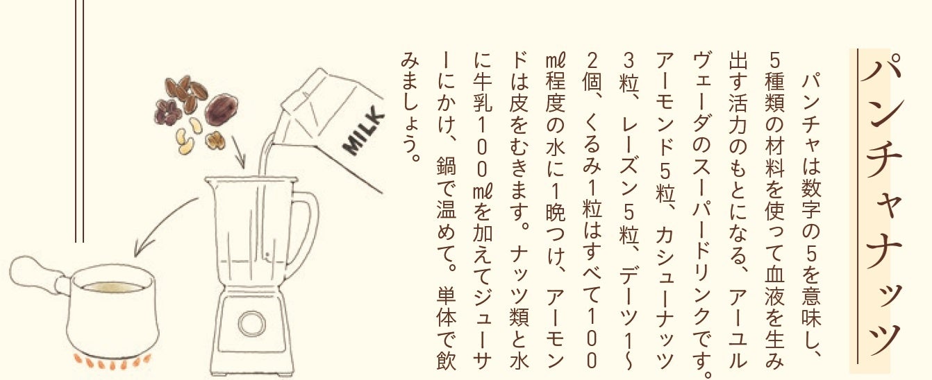 「女性の悩みには、子宮を元気にするといわれるアーユルヴェーダのスーパードリンク『パンチャナッツ』をどうぞ」。アーモンド、カシューナッツ、レーズン、デーツ、くるみを1晩水につけ、牛乳とミキサーにかけたもの。「体を滋養で満たし、不調をラクにしてくれます」。