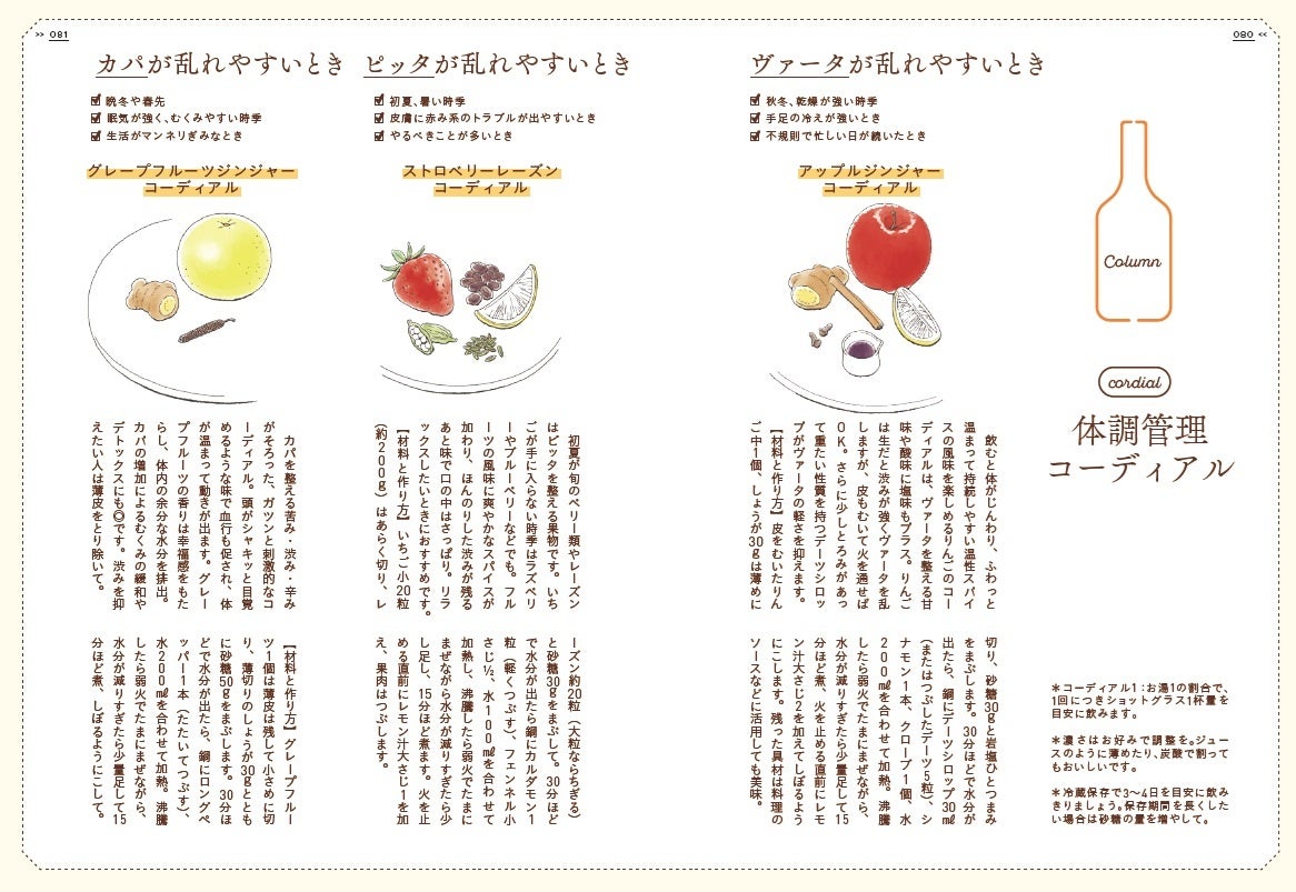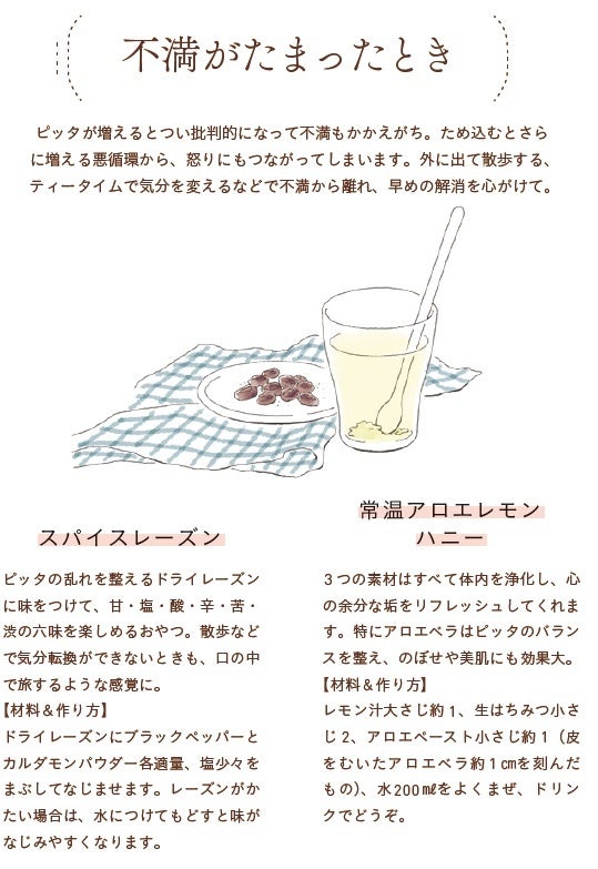 同書には、心のセルフケア法も。「不満解消を助ける食材を使ったティーとおやつでリラックスを」。体内を浄化し、心をリフレッシュするレモン汁、生はちみつ、アロエペーストと水をまぜたドリンクと、レーズンにブラックペッパーとcardamonパウダー、塩をまぶしたスイーツをどうぞ。