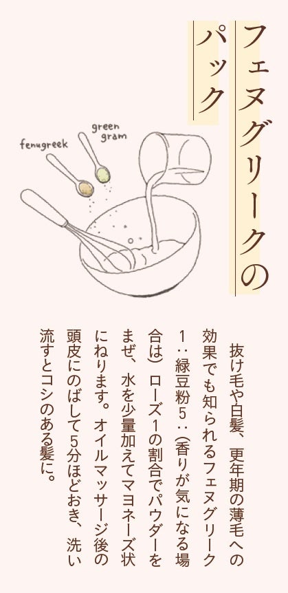 「アーユルヴェーダでは、大人の髪のケアにフェヌグリークというスパイスをよく使います」。フェヌグリークと緑豆粉、ローズパウダーを水で練り、頭皮をパック。コシやツヤが蘇ります。