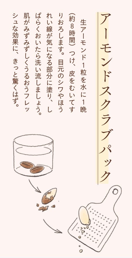 同書では、大人の美容ケアも紹介。「大人の肌悩みに効くのは生のアーモンドです。体を元気にするオージャスというエネルギーをつくることを助けるといわれています」。1晩水につけた生アーモンドの皮をむき、すりおろしてパックすると、輝きのある滑らかな肌に。
