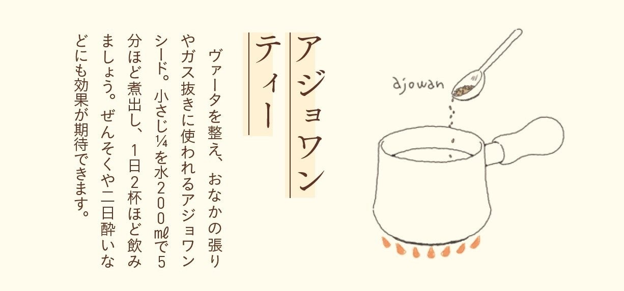 「アーユルヴェーダでは、アジョワンというスパイスをおなかの張りの解消やガス抜きによく使います」。アジョワンシードを水で5分ほど煮だし、1日2回ほど飲めば、おなかの調子が整います。