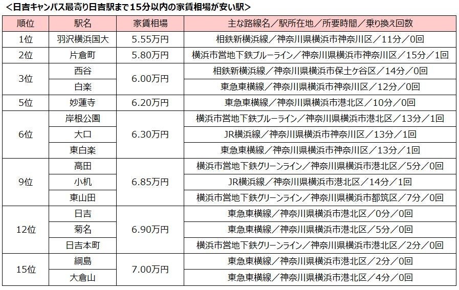 【調査対象駅】三田キャンパス:SUUMOに掲載されている田町駅、三田駅、赤羽橋駅まで20分以内、日吉キャンパス:日吉駅まで電車で15分以内の駅(掲載物件が20件以上ある駅に限る)