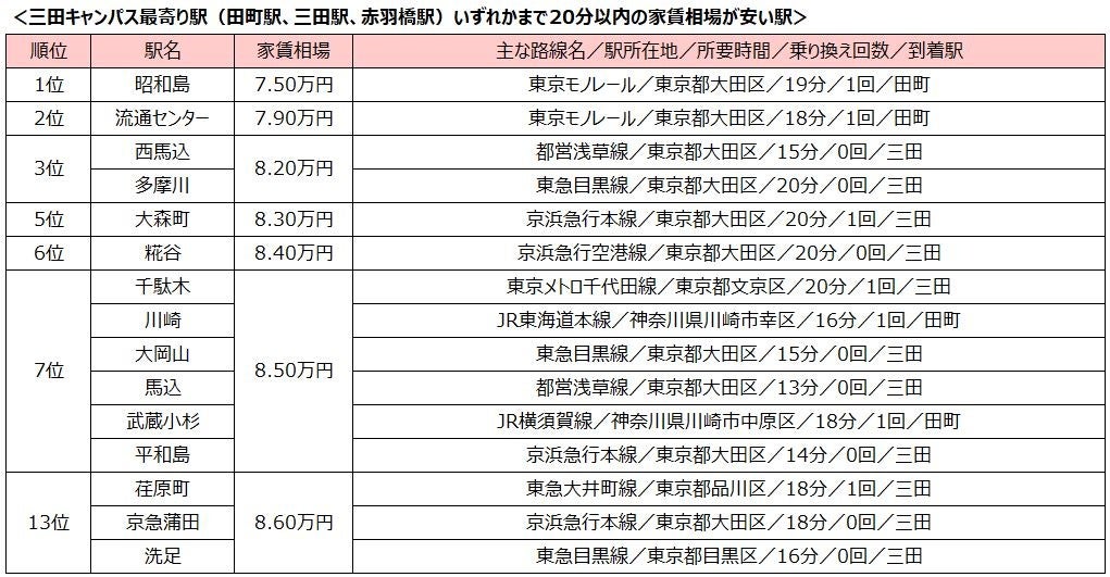続いては、三田キャンパスの最寄り駅である田町駅・三田駅・赤羽橋駅いずれかまで電車で20分圏内に位置し、家賃相場が安い駅のランキングをご紹介します。