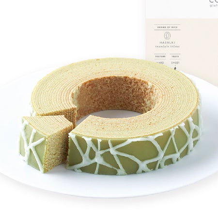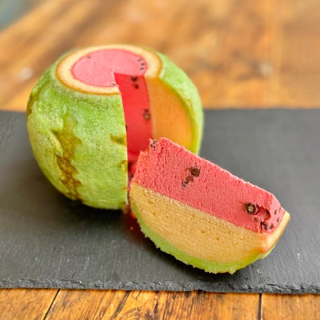 北海道初登場。スカイの種はチョコチップ・スイカ味のムースを流し込みました。外の皮はメロン味。バームクーヘン生地は千葉県産コシヒカリ使用。