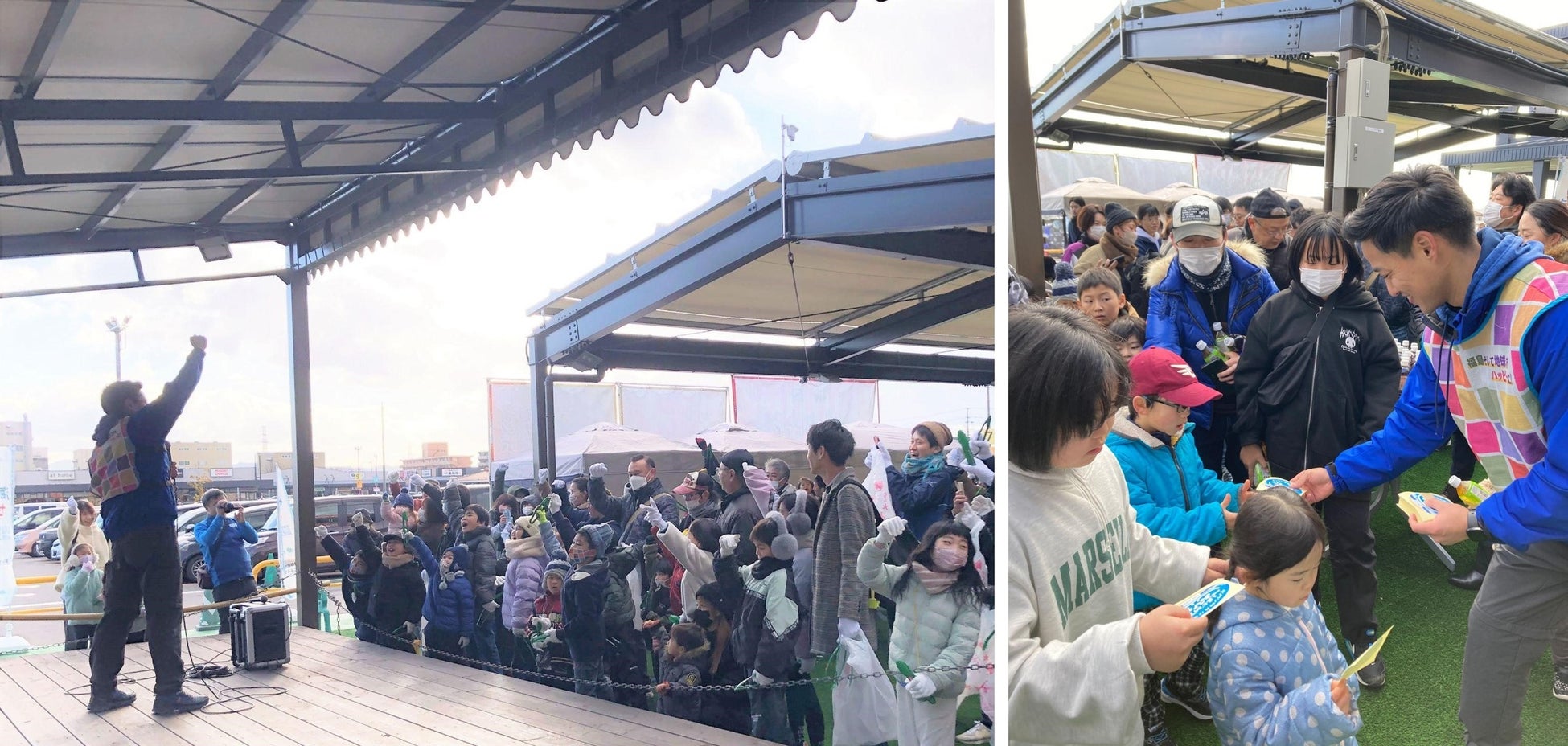 朝寒のイオンタウン郡山に集まった子供達は元気いっぱい!鈴木ブンケンさんが登場すると、キラキラした目で「ブンケンさ~ん!おはよ~!」と大きな声でご挨拶をし、やる気満々の雰囲気。