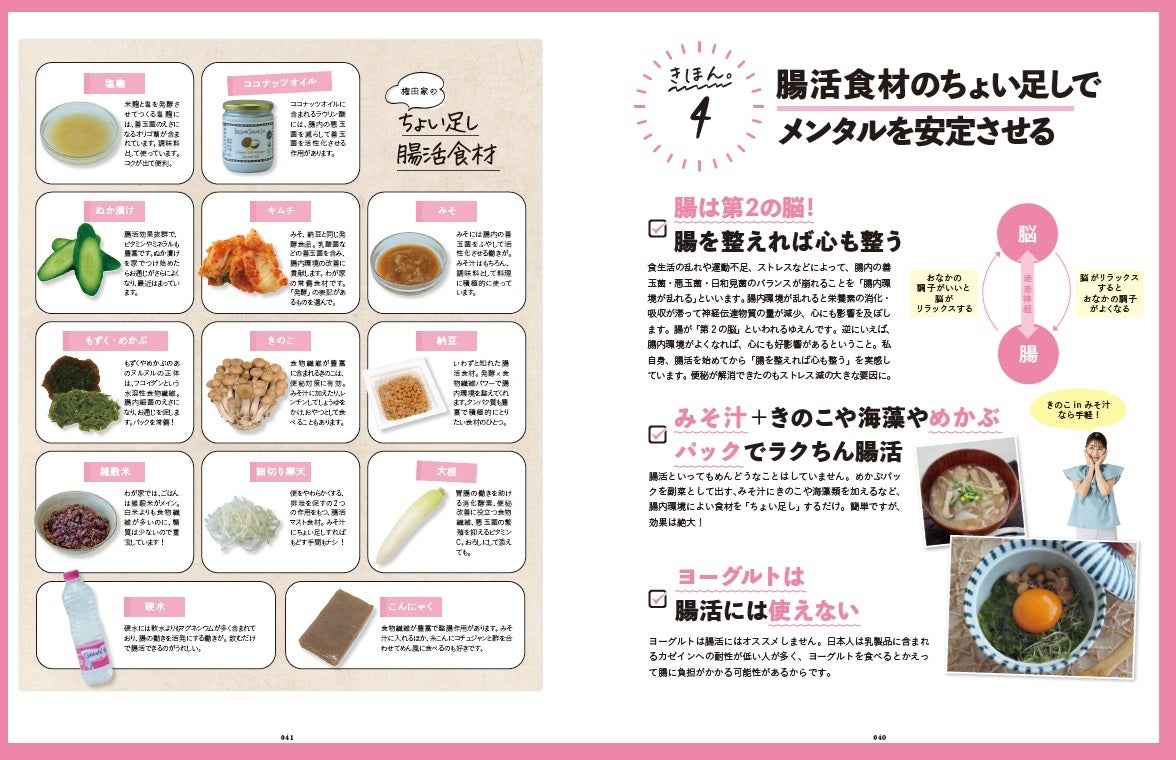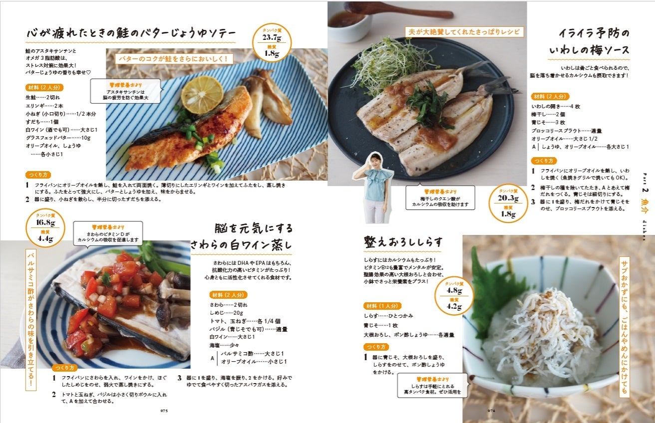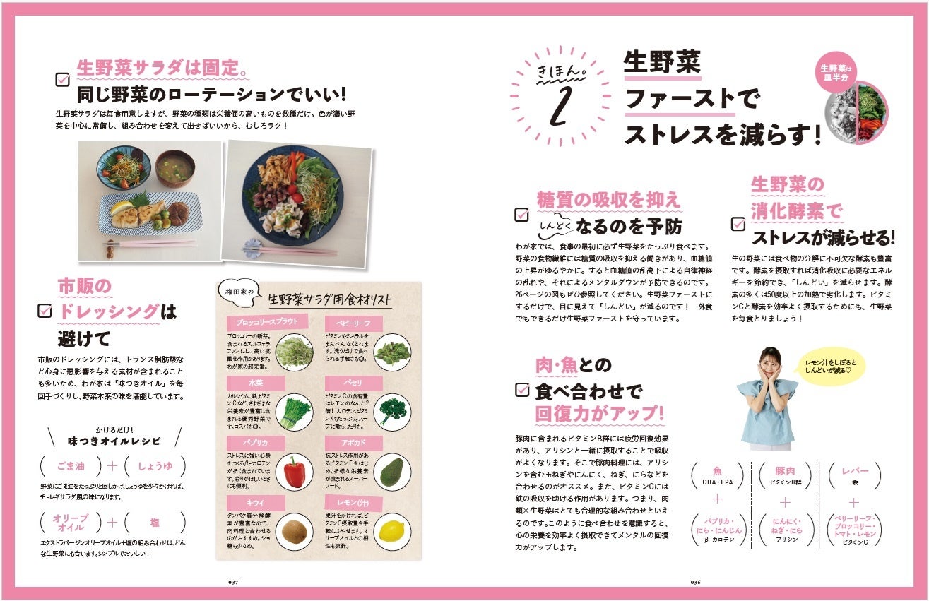「タンパク質の消化・吸収をたすける酵素や、ビタミンやミネラルの補給源として、生野菜を食事の最初にとるのもルールです。野菜の種類は毎回同じでOK」。腸から脳をラクにするみそなどの発酵食品や、きのこなどの食物繊維もたっぷりと、脳疲労をやわらげる鉄や亜鉛、DHAやEPAを含むレバーや貝類なども積極的にレシピに。