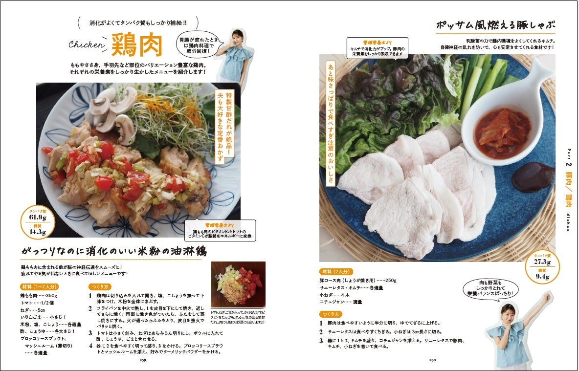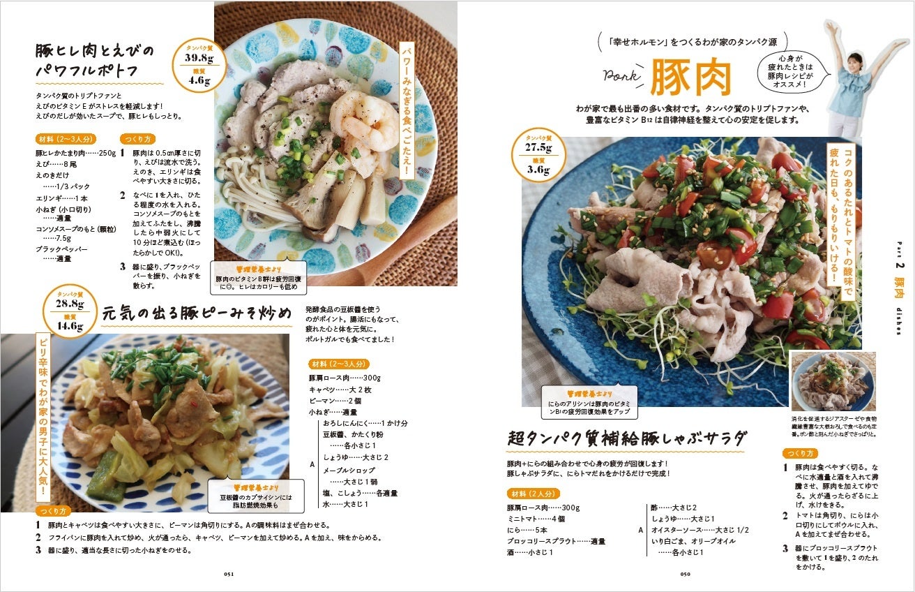 「タンパク質は筋肉や骨、血液といった体の組織をつくり、『幸せホルモン』と呼ばれる脳内物質・セロトニンの生成に欠かせない栄養素。栄養価の高い豚肉・鶏肉・魚介類・レバーをローテーションすると、体が栄養素で満たされ、脳にも栄養が回るのです」。
