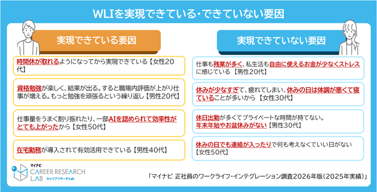 WLIが「実現できている」理由を見ると、「時間休の取得」や「在宅勤務」の活用など、働く時間や場所の柔軟性を挙げる声が多く見られ、「AIの活用」による業務効率化や、「資格勉強」が仕事に好影響を与えているといった回答もあった。